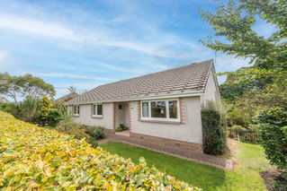 To the rear, the south-facing garden enjoys a delightful position backing onto woodlands that lead towards Lade Braes. A gate at the end of the garden provides direct access to Lade Braes. Thoughtfully designed, it features an expansive alfresco terraced dining area with stone steps descending to the lush lawn, the latter enhanced with mature shrubbery, trees, and borders.