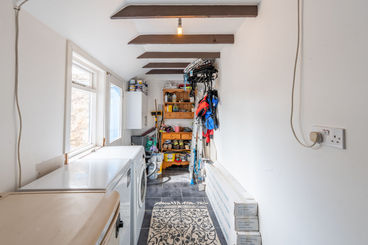 To the side lies a south-west-facing alfresco seating area, a peaceful suntrap designed for dining and relaxing. A generously sized storage building is situated in the rear garden.