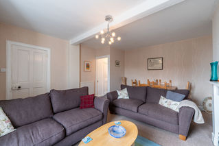 Enjoying captivating first-floor views across to the iconic May Island, this charming C-listed three-bedroom end-terrace home in the picturesque village of Crail offers a rare opportunity to acquire a characterful residence in an idyllic coastal location. With its coastal blue window trims and whitewashed façade featuring the building date of 1895 alongside a depiction of a sailing boat, this delightful property offers instant appeal. Stepping through the entrance vestibule into a welcoming hallway you come to a charming south-east-facing living room. Bathed in natural light from a sash and case window, it features elegant wooden flooring, a built-in press, picture rail, and soft neutral décor. A log-burning stove set within a stone hearth and topped with an oak mantle adds warmth and character, making it an inviting space to unwind. Across the hall, a versatile sitting and dining room mirrors the living room’s tasteful aesthetic and orientation. Complete with carpeting, a built-in press, and an open cast iron fireplace with an antique brass hood, it exudes timeless appeal. To the rear lies a modern kitchen and adjoining utility room with direct access to the garden. Almost galley in style, the kitchen boasts sleek white wall and floor cabinetry, black quartz-effect worktops, and a tiled splashback, along with an integrated oven and hob. A handy guest WC completes the ground floor. Upstairs, the carpeted staircase with a rope banister leads to a bright, south-east-facing principal double bedroom with views across to the Bass Rock. Decorated in soothing tones and with a luxurious en-suite bathroom featuring a bath with overhead shower, WC, washbasin, and chrome towel radiator it offers a tranquil retreat. Two further bedrooms, one double and one single, are equally well presented and share a stylish family bathroom with a white three-piece suite.