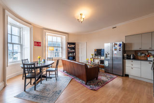 Situated in the very heart of St Andrews, this spacious and bright two-bedroom apartment is housed within a Category B-listed building dating back to the early 19th century. Rarely available and occupying such a prime position, it will make a delightful home or lucrative investment. Upon entering the second-floor property, a good-sized hallway leads you to an impressive open-plan living, dining, and kitchen area. Flooded with natural light from east-facing sash and case windows, the space is elegantly appointed with wood-inspired flooring and a neutral colour palette accentuating its airy feel. Thoughtfully designed to maximise the layout, the modern kitchen features sleek wall and floor units in a glossy natural hue, complemented by smooth black worktops and a tiled splashback. Integrated appliances include a hob and oven and there is ample space for freestanding units such as an American-style fridge/freezer. Across the hallway, the two west-facing double bedrooms offer comfortable retreats, with one enjoying a charming skyline view of St Salvator’s Chapel steeple. Both share access to a modern shower room featuring a hidden cistern WC, washbasin built into vanity, and a chrome towel radiator.